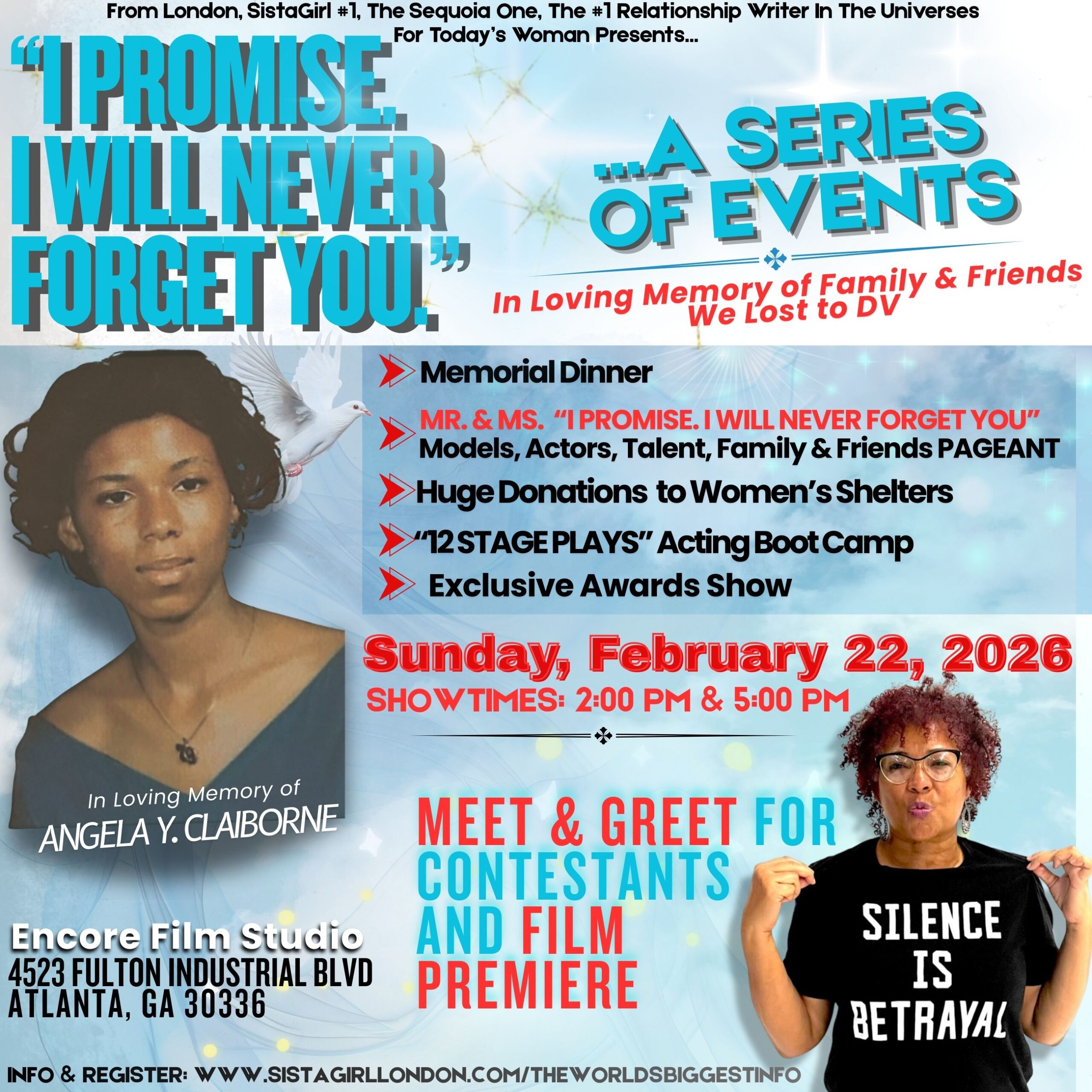 ***JOIN**** “I PROMISE. I WILL NEVER FORGET YOU.”- THE BIGGEST DOMESTIC ABUSE PREVENTION PAGEANT/ACTING BOOT CAMP” IN THE WORLD … ***AND*** … GET THE GREATEST DOMESTIC ABUSE PREVENTION TEXTBOOK IN THE WORLD … AS YOUR ***EARLY BIRD*** GIFT!!! (RELATIONSHIP VIDEOS ARE BELOW)